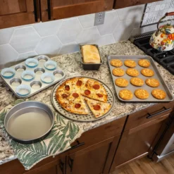 With this set, you can go all out making your specialty desserts: lavender lemon cookies, hummingbird cake, zucchini bread, cinnamon rolls topped with marshmallow creme and walnuts, and so much more! The easy-release nonstick coating of each piece is made from a PFOA-free ceramic that prevents foods from sticking and burning to the surfaces of the bakeware, making them very easy to clean by hand. Due to their construction, it is advised that one uses plastic, silicone, or wooden tools to remove foods from the surfaces of each piece of bakeware to avoid scratching and scuffing the nonstick coating—this will keep your bakeware in tip-top shape!