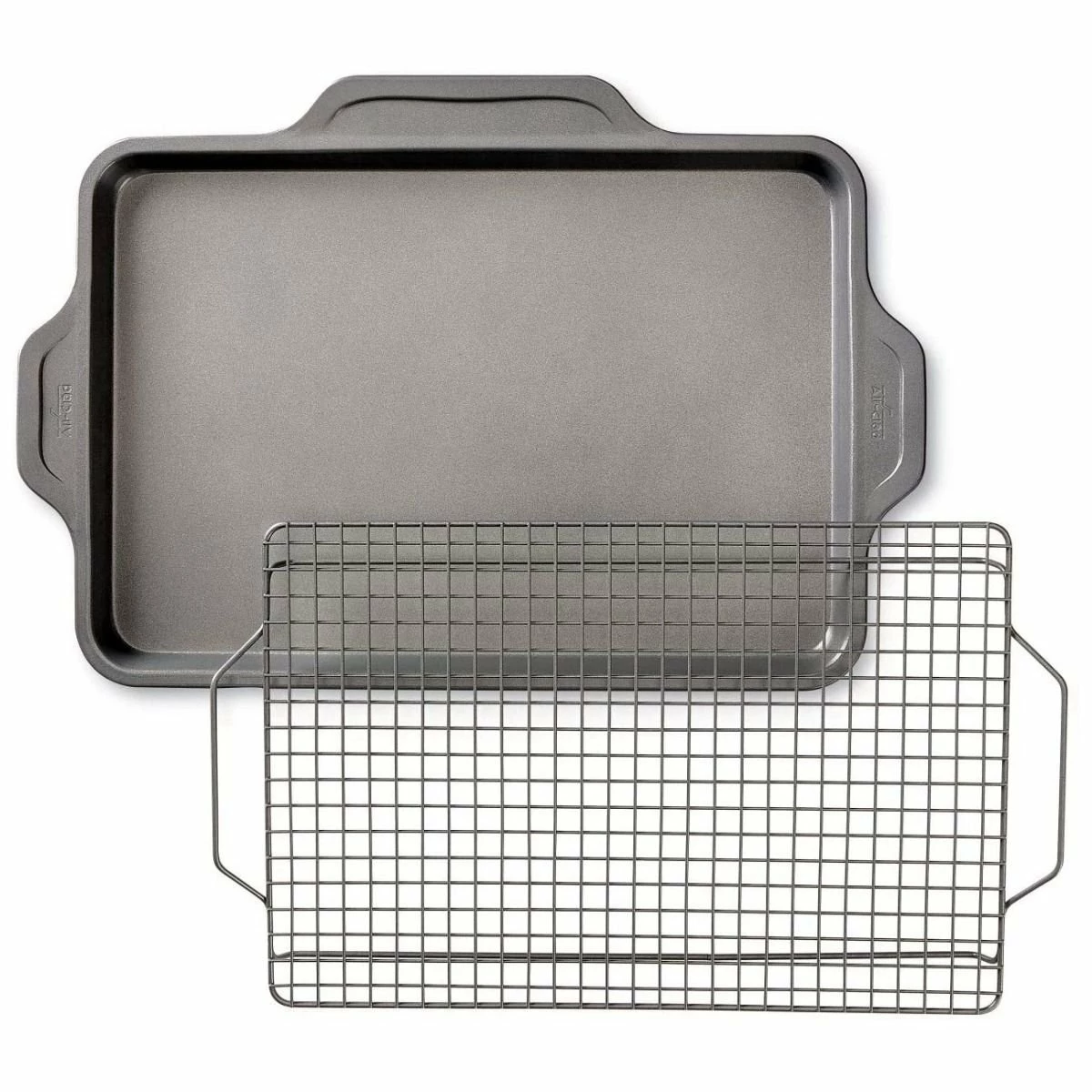 You’ll never find yourself in a sticky situation with All-Clad’s Pro-Release Bakeware line! This All-Clad Pro-Release 2-Piece Set includes a Half Sheet Pan and a Cooling & Baking Rack that nestle perfectly inside each other. Use the Half Sheet Pan for baking homemade treats that slide out of the pan effortlessly, then place them on the Rack for even and efficient cooling. Use the Half Sheet Pan and Rack together for crispier results and less greasy, mess-free bacon! All-Clad Pro-Release Bakeware is constructed of heavy gauge aluminized steel so your delectable desserts come out perfectly browned every time. With a ceramic-reinforced, PFOA-free nonstick finish, food slides off the sheet hassle-free so cookies and pastries keep their bottoms. All items in the Pro-Release line are designed with ultimate functionality and durability for passionate bakers. That’s why Pro-Release items are scratch-resistant, warp-resistant, and feature easy-grip, oversized handles so moving pans in and out of the oven is safe and easy. Get photo-worthy homemade baked goods every time with All-Clad’s Pro-Release Bakeware line today!