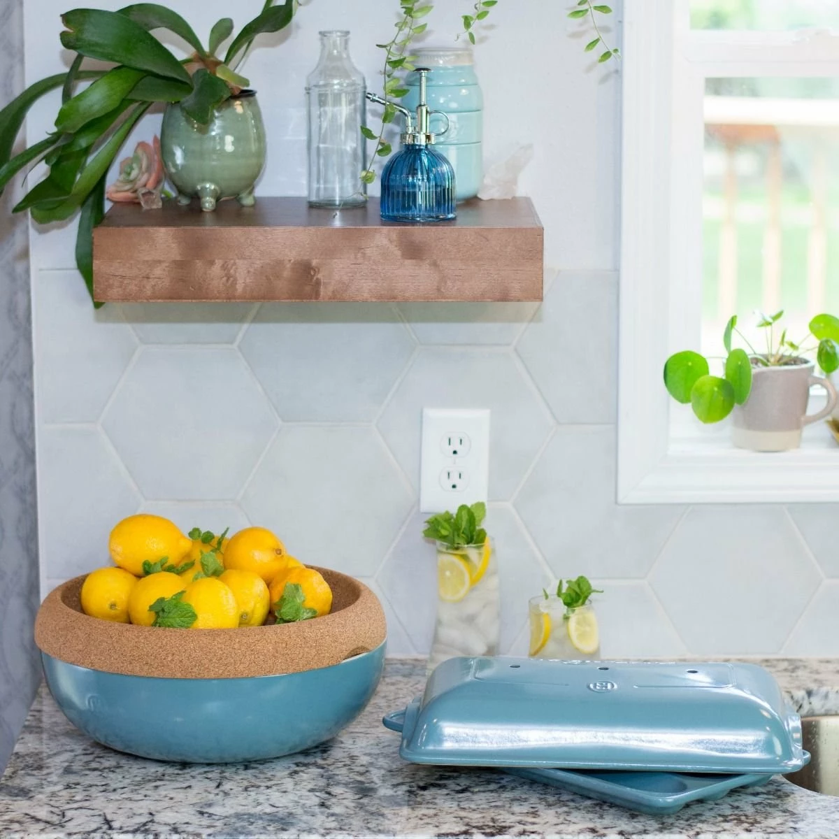 Emile Henry Large Storage Bowl: This extravagantly large storage bowl is cleverly designed with two space-saving storage levels. The antimicrobial & hypoallergenic cork bowl top acts as a lid for the ceramic base, so you can display fresh colorful fruit on top while preserving unripe fruits & vegetables out of sight in the base. Its large size and stylish cork + ceramic construction make it a great centerpiece for the kitchen or coffee table.