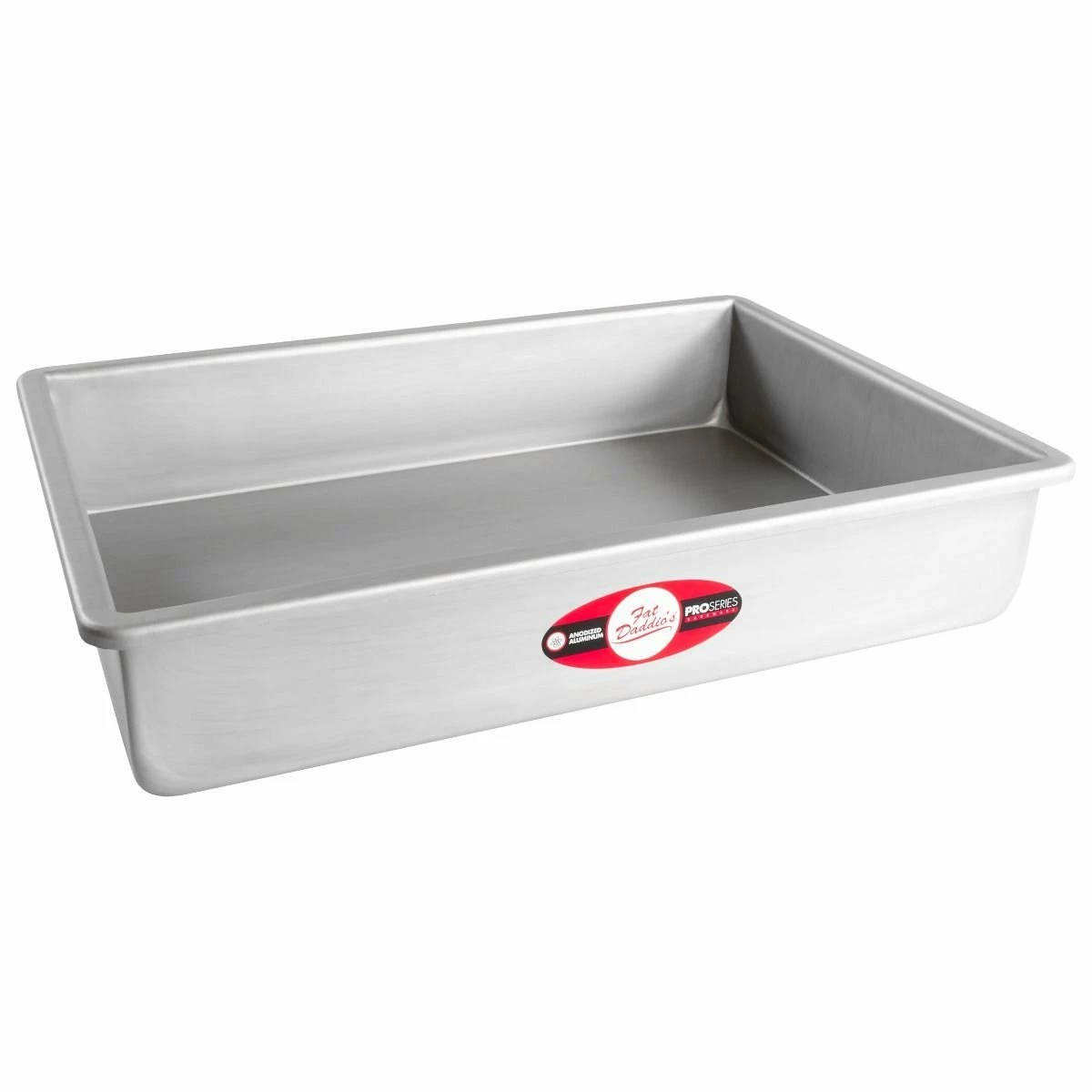 Bake individual sheet cakes or stack cakes for a multi-layered creation with Fat Daddio’s 11” X 15” X 3” Sheet Cake Pan! This pan is created with strong anodized aluminum that won’t discolor food or transfer chemicals. The edges are straight, which makes it easy to add layers or create a smooth frosting surface.