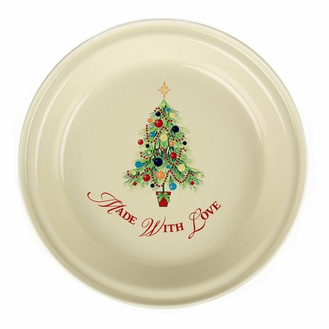 Your favorite pie or quiche recipe will be the hit of every holiday party when you serve it in Fiesta®’s Deep Dish Christmas Tree Pie Dish! Fiesta®’s cheerful Christmas tree pops in its array of colors on this Ivory pie pan, while “Made with Love” is in a pretty font under the tree. With elements of the concentric ring detailing you love about your other Fiesta® pieces, this dish will be blend in nicely with the rest of your Christmas Tree collection. And with so many pretty signature Fiesta® colors in the design, it will be a festive complement to any of your other dinnerware and serveware as well.