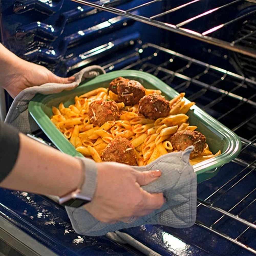 Bring your family running to the table when you serve cheesy lasagna in Fiesta®’s 9″ x 13″ Rectangular Baking Pan in Meadow Green. Made with Homer Laughlin’s signature Fiesta® china, this baker is fully vitrified, making it industrially strong and nonporous so it won’t absorb odors or moisture. It’s oven safe to 500º F, microwave, dishwasher, and freezer safe. The pretty Meadow glaze emphasizes the signature Fiesta® concentric ring detailing around the top. You might be tempted to save this beautiful baking dish for special occasions, or only use it for display, but it’s strong and comes with a 5-year chip-free warranty, so you don’t have to be afraid to use it every day! Use this pan to roast a chicken with vegetables, for lasagnas and pasta bakes, for casseroles, and for brownies and desserts.