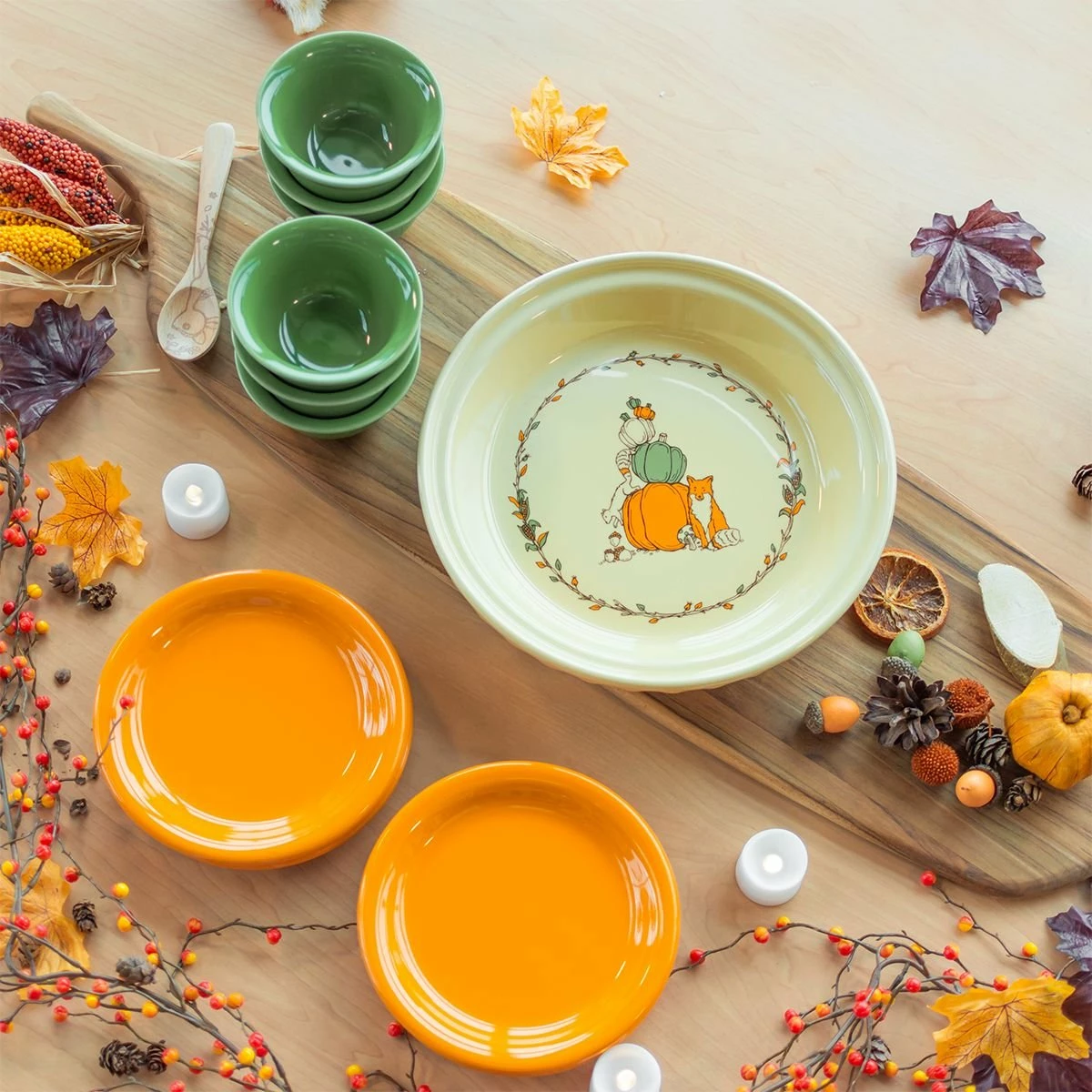 With so many different ways to enjoy a pie, how can you just choose one? Whether it’s a savory chicken pot pie or a sweet, hot apple pie, the Fiesta® Pie a La Mode for 6 Set has everything you need to bake & serve a delicious pie to your family & guests. The 10.25″ Deep Dish Pie Baker is from the beautiful Everything Kitchens exclusive Fall Forest Collection! You will be surrounded in a crisp cool, autumn air where the leaves magically change colors before your eyes & curious little woodland creatures peek from behind the trees, pumpkins & cornfields to say hello. The Butterscotch & Meadow pattern featured on the traditional Fiesta® Ivory Deep Dish Pie Baker has a fun fox & scampering squirrel duo with a tower of pumpkins; the design is bordered with branches entwined with corn, fall leaves & flowers.
