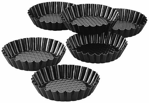 Great for making individual tarts, pies, quiches and more! The steel construction of these Frieling Mini Tart Pans helps to ensure even baking. With a durable teflon nonstick coating tarts will come out easily from these Frieling Tart Pans. This set of Frieling Tart Pans comes with six mini tart pans measuring 4 inches in diameter.