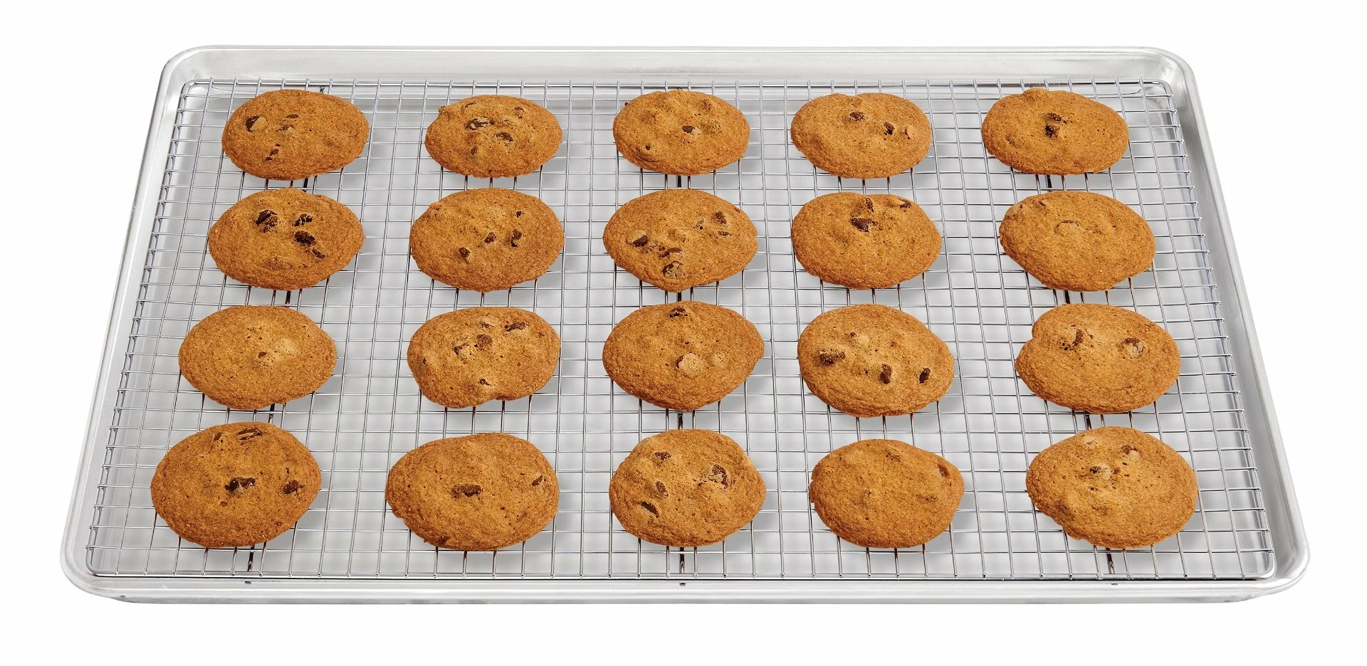 Don’t let your freshly-baked cookies fall victim to soggy-bottoms! Keep them perfectly crisp by elevating them as they cool with the Mrs. Anderson’s Baking Big Pan Cooling Rack! If left on the baking tray, steam will accumulate under baked treats as they cool, causing sogginess and sticking; removing them to a cooling rack easily solves that problem. This rack has a tight grid design so delicate foods won’t crumble through. It’s made from heavyweight chrome wire that’s durable, but won’t scratch surfaces, and thanks to its reinforced frame, it will easily support heavier baking pans and casserole dishes. In addition, it perfectly fits Mrs. Anderson’s Baking’s Two-Thirds Big Sheet Pan. Use them together to bake veggies, “oven-fry” chicken, or to roast a pork loin. Or use this baking rack by itself to cool pastry, to drizzle glaze over cookies, or to place your chocolate-dipped pretzels while they set.