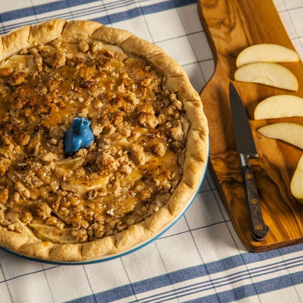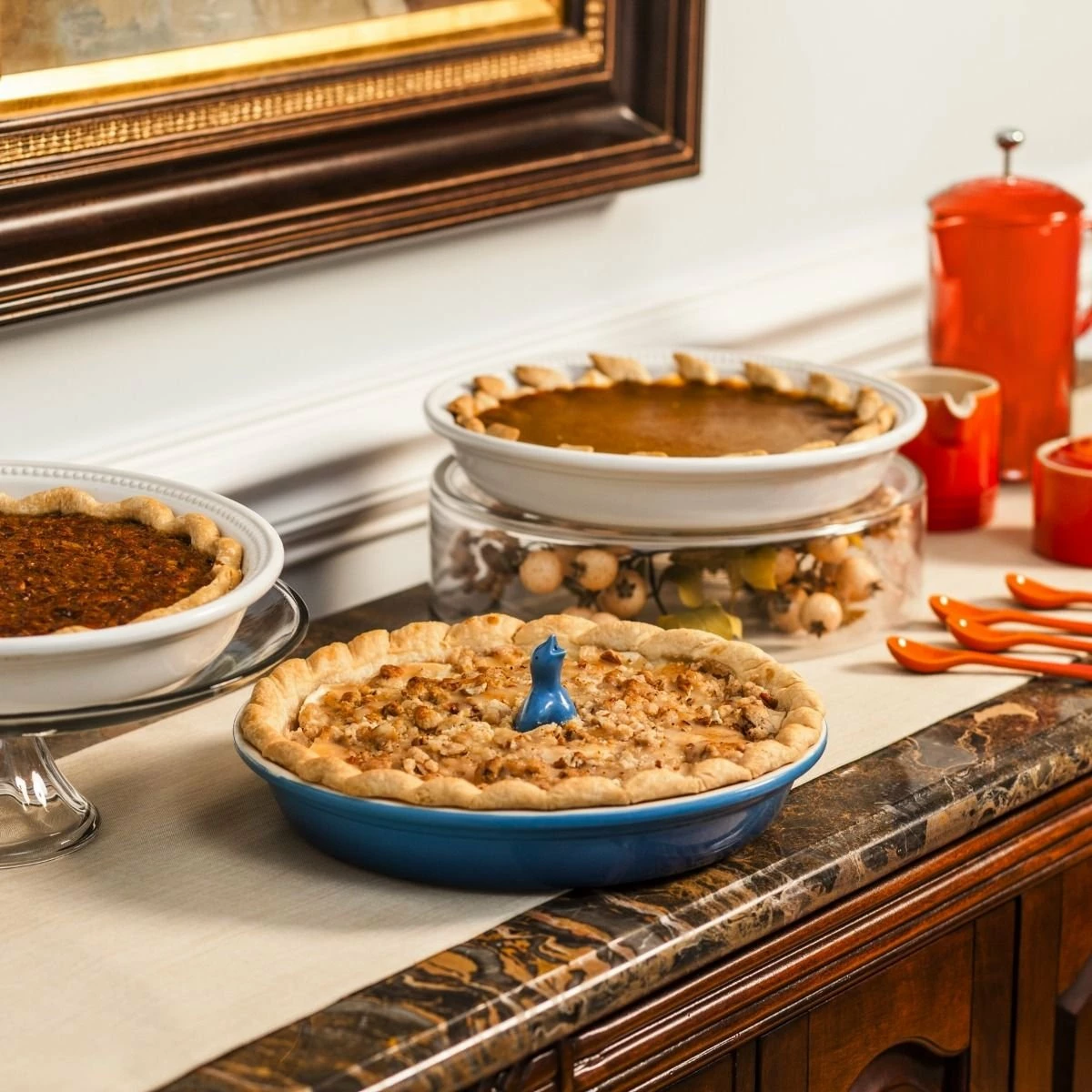 At 9 inches across by 1.5 inches tall, the Le Creuset PG1855 Heritage pie dish (here in Marseille Blue) is a good option for making deep-dish apple pies with golden latticework, cheesecakes with buttery graham-cracker crusts, or pumpkin pies & pecan pies for holiday get-togethers.