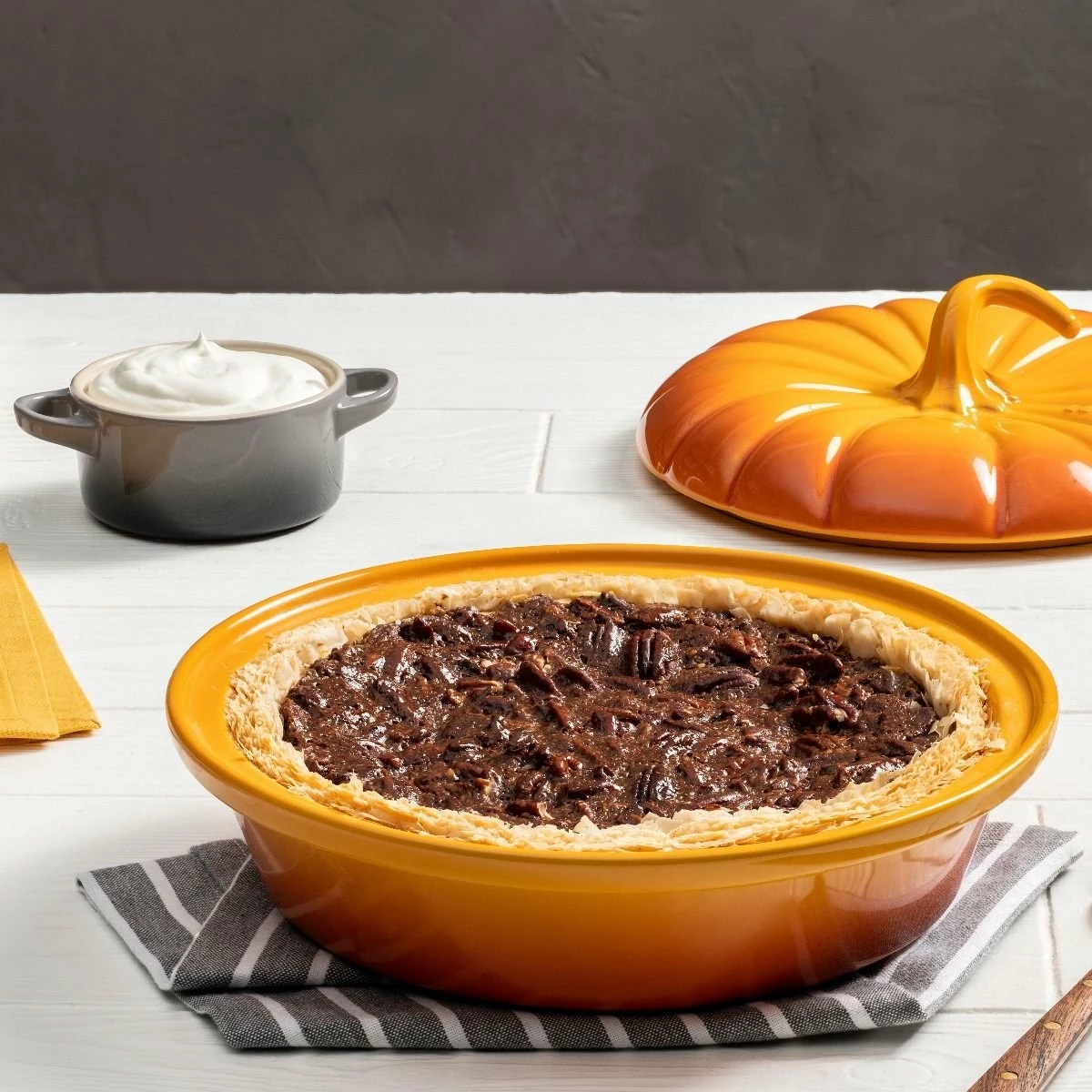 Add festive elegance to all your fall gatherings with the Pumpkin Baker from Le Creuset. This delightful dish is shaped like a pumpkin, complete with a lid and integrated stem-shaped knob, a sophisticated and charming accent to any table. Featuring Le Creuset’s rich Persimmon, the burnt orange color of this cocotte makes a bold seasonal statement to complement your autumn decor.