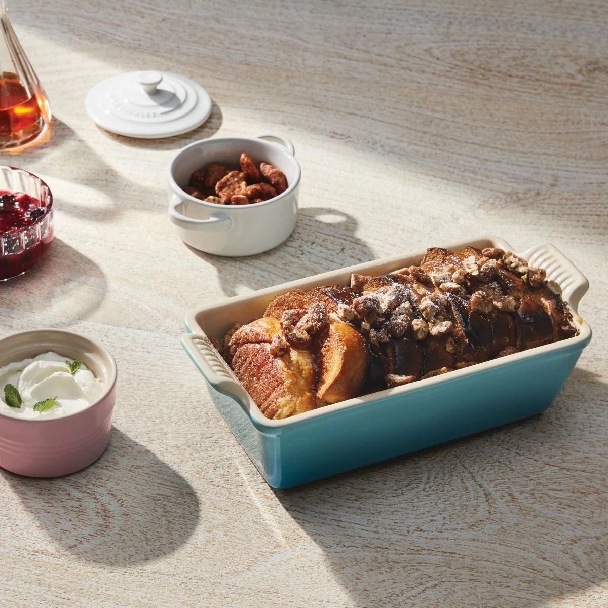 - Le Creuset Stoneware Loaf pan has exterior enamel which resists scratches and stains