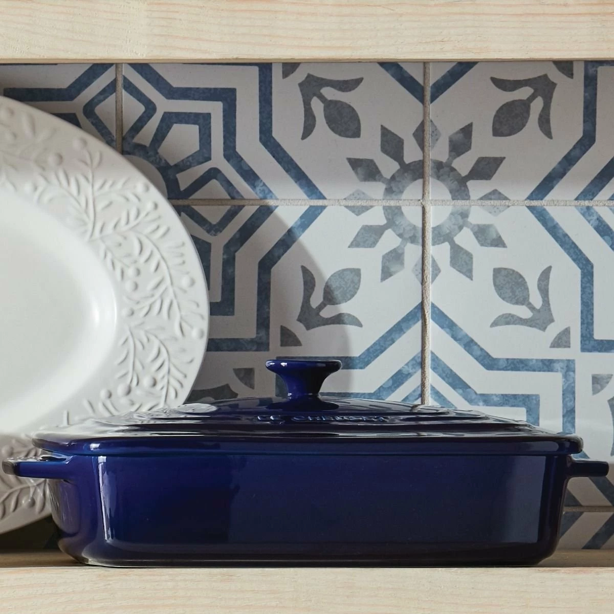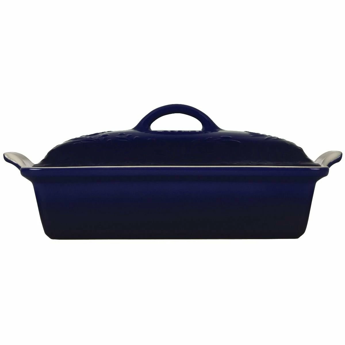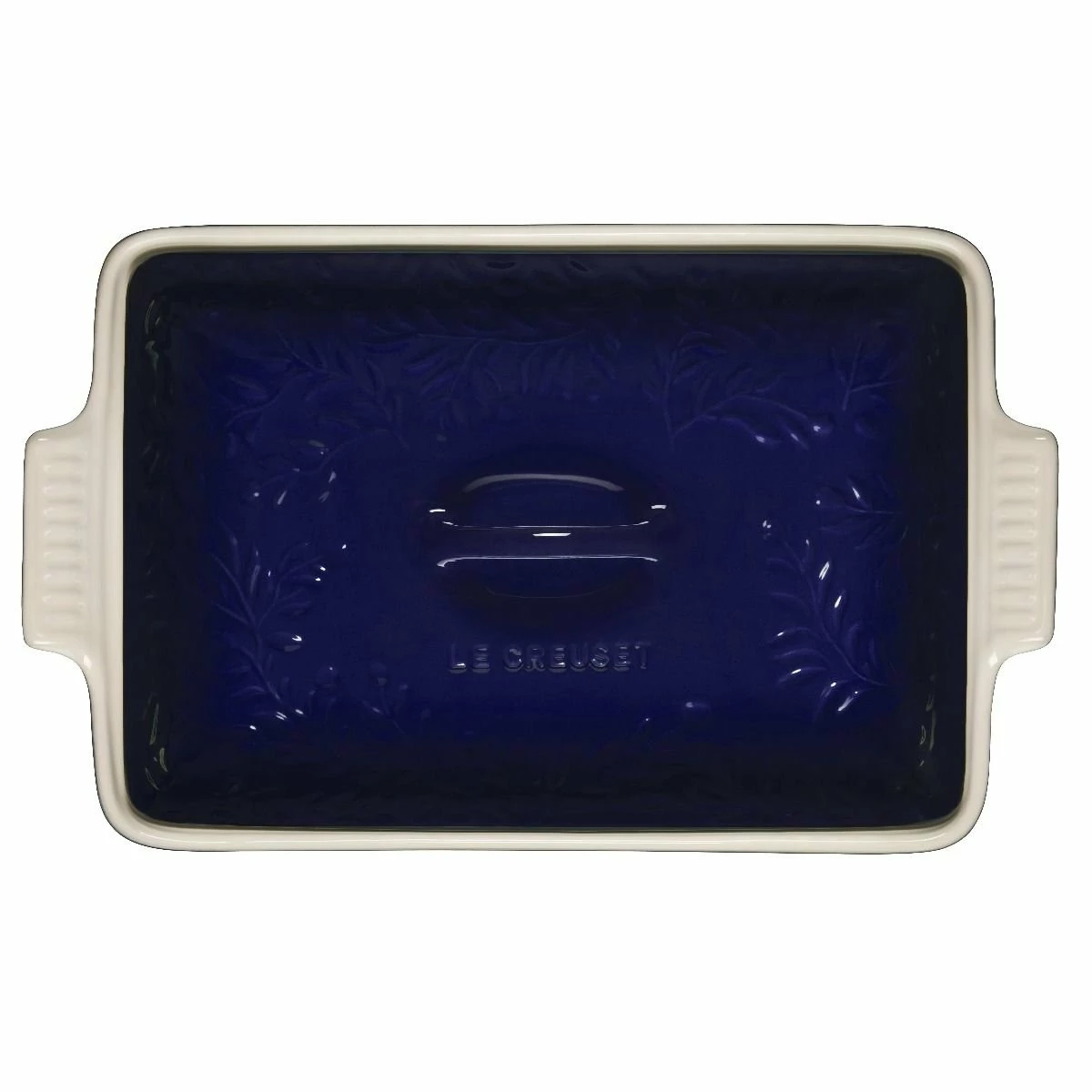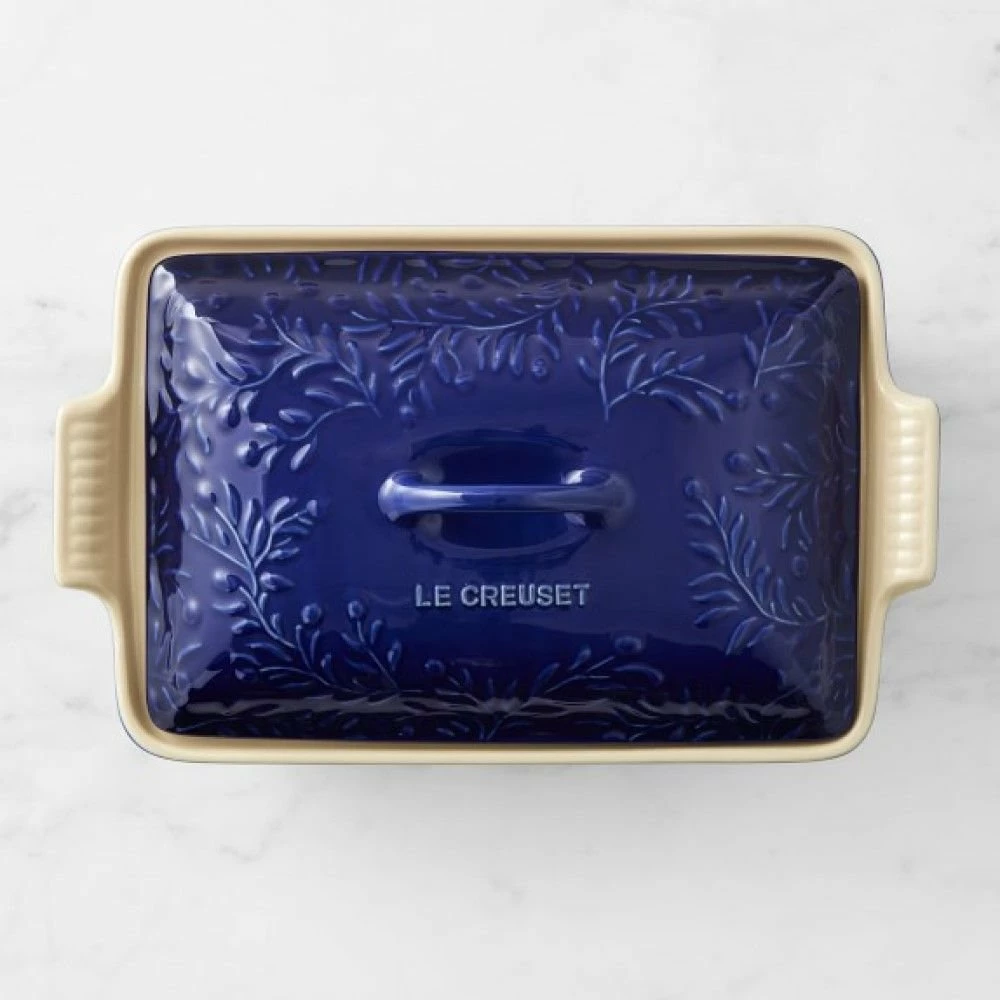 Set the standard for sophistication at your dining table with the Heritage Covered Casserole from Le Creuset’s Olive Branch Collection. Crafted from durable, scratch-resistant stoneware, this 4-Quart casserole dish can accommodate most of your baking needs and includes a secure-fitting lid with handle for easy serving. Delicious breakfast casseroles, savory lasagna, decadent chocolate chunk brownies — no matter what you’re craving, this casserole is a quality piece of bakeware that you can take directly from oven to tabletop for serving. The rich, calming Indigo Blue color and the detailed olive branch embossments are ideal for those with a fondness for nature and a discerning taste. For a statement piece that is as elegant in form as it is in function, order your Olive Branch Collection Heritage Covered Casserole today.
