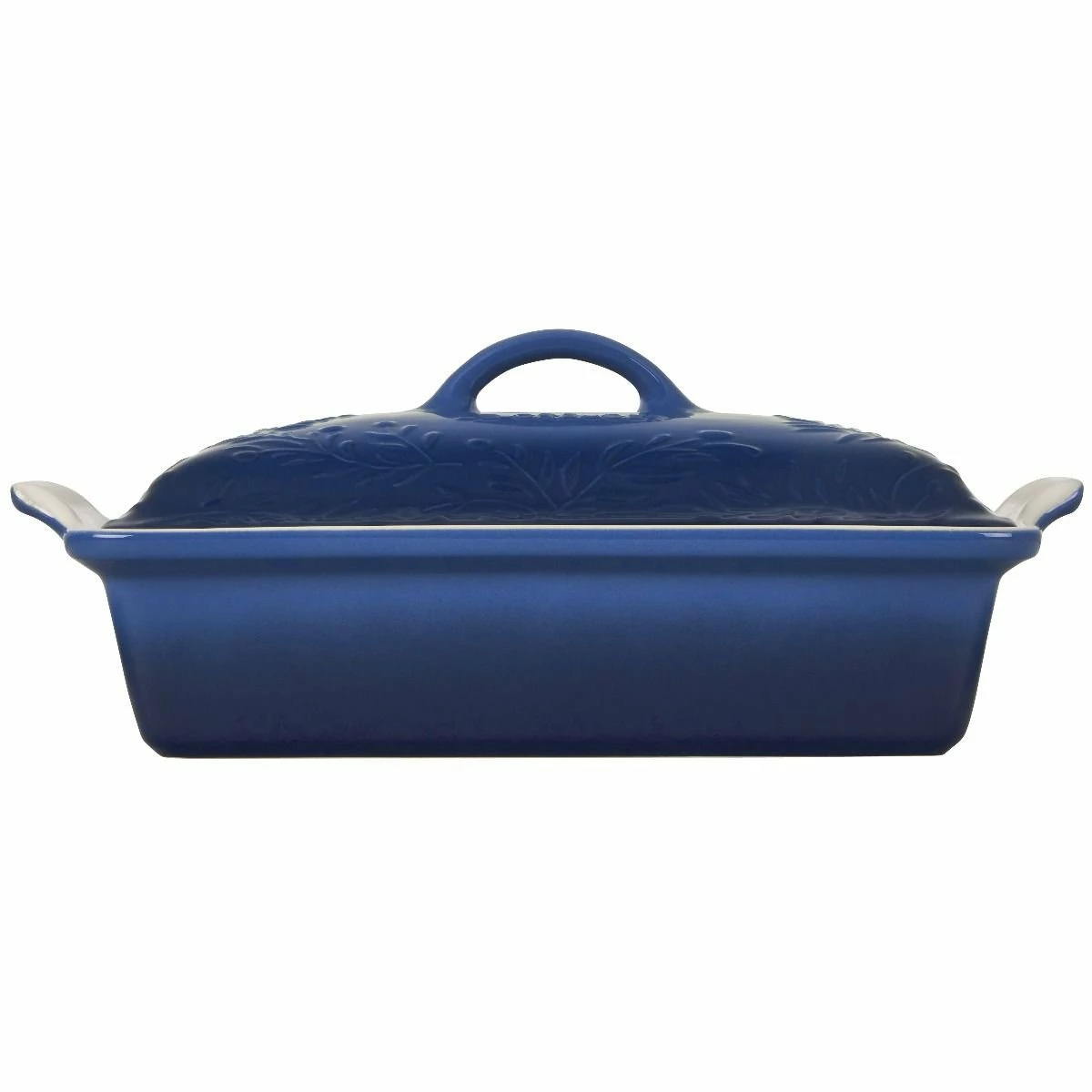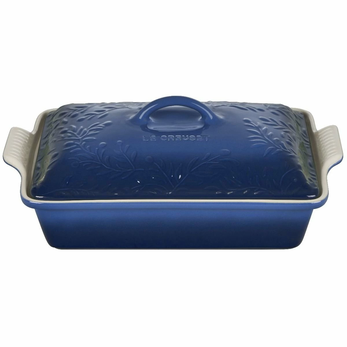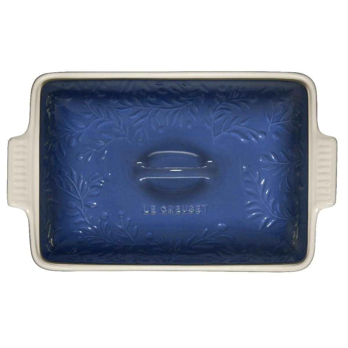 Set the standard for sophistication at your dining table with the Heritage Covered Casserole from Le Creuset’s Olive Branch Collection. Crafted from durable, scratch-resistant stoneware, this 4-Quart casserole dish can accommodate most of your baking needs and includes a secure-fitting lid with handle for easy serving. Delicious breakfast casseroles, savory lasagna, decadent chocolate chunk brownies — no matter what you’re craving, this casserole is a quality piece of bakeware that you can take directly from oven to tabletop for serving. The striking blue inspired by the waters along the Mediterranean Coast at Marseille and the detailed olive branch embossments are ideal for those with a fondness for nature and a discerning taste. For a statement piece that is as elegant in form as it is in function, order your Olive Branch Collection Heritage Covered Casserole today.