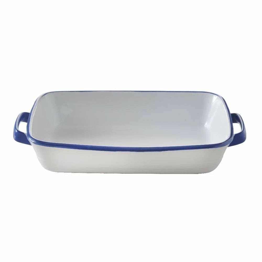 Enjoy the classic styling of the Mason Cash Enamour rectangular baking dish for the oven and tabletop. The tasteful blue accents pay homage to the early beginning of mass produced enamel pots and tin cans and brings a refined look to both the kitchen and the table. The 2.5 quart capacity is great for pastries or cakes. Mason Cash’s Enamour rectangular baking dish embodies the ‘oven-to-tableware’ narrative, with it’s nostalgic white base and blue accents, and fits in at any family dinner setting.