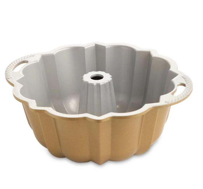 Bake deliciously ornate bundt cakes in this Nordic Ware Anniversary Bundt Pan with a gold finish! This bundt cake pan is made of durable, easy-clean cast aluminum. Delicate lemon cream cakes and moist, rich chocolate crown cakes smoothly slide out of the pan’s nonstick surface, perfectly preserving the details in the bundt molds.