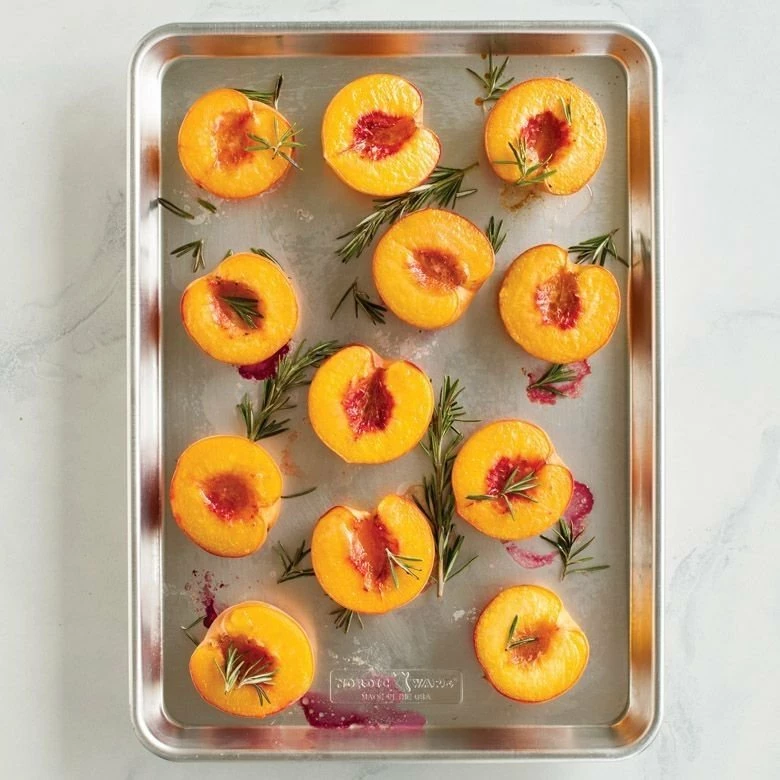 Make delicious one-pan dinners with the Baker’s Half Sheet Pan with Storage Lid by Nordic Ware! At 18″ x 13″, it’s large enough to make dinner for the family and the perfect size to fit in a home oven. This sturdy sheet pan is made of natural, professional-grade aluminum that will never rust, while offering superior heat conductivity that gives consistent, evenly browned results every time you bake. A reinforced, encapsulated rim prevents warping and offers lifetime durability. When you add this pan to your baking collection, you’ll understand why professional grade aluminum pans are the preferred choice for bakeries and commercial kitchens. Use it to roast vegetables, bake desserts, toast granola, or make sheet pan suppers!