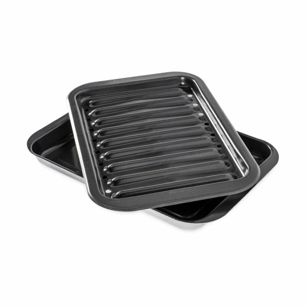 Broil your favorite dishes to perfection with the Broiler Grill and Oven Pan from Nordic Ware. This two-piece set features a ribbed broiling rack and a multipurpose drip pan that can also be used as a baking pan. Made of nonstick-coated aluminized steel, this set should be seasoned with vegetable shortening prior to each use for best results. Hand-wash and avoid metal utensils to preserve the nonstick coating’s longevity. For a delicious sear on your honey garlic salmon, a satisfyingly crunchy layer on your baked macaroni and cheese or asparagus broiled to a perfect crisp, order your Nordic Ware Broiler Grill and Oven Pan today!