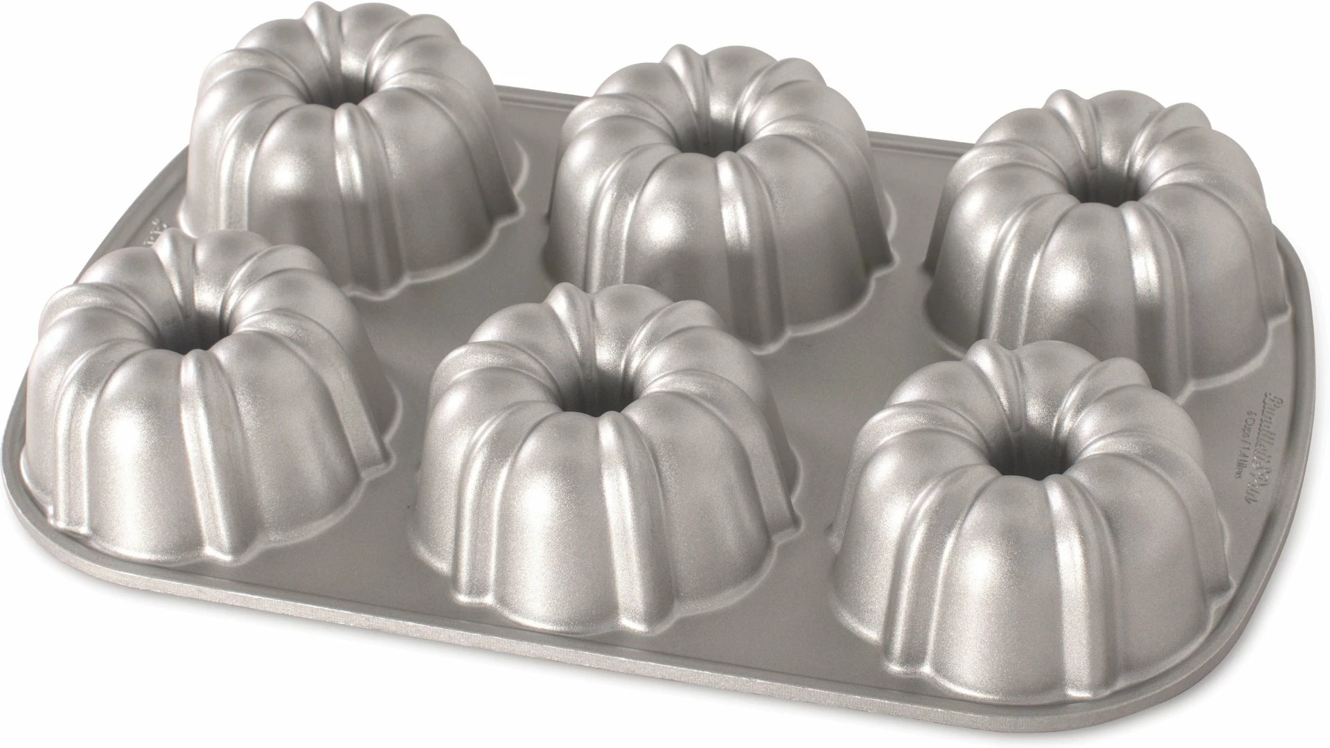 Make your favorite recipes into perfectly portioned treats with the Nordic Ware Bundtlette Pan. This pan features six identical bundt molds, each with a 1-cup capacity, making perfectly sized bundt cakes for individual desserts. With its cast aluminum construction this pan is designed to be used for years to come while the nonstick coating easily releases food so you get perfectly formed bundtlettes every time. Beyond individual cakes, the Bundtlette Pan is also perfect for jello or flan, allowing you to customize your desserts to your mood or occasion. Make unique desserts that cater to any event with the Nordic Ware Bundtlette Pan, get yours today!