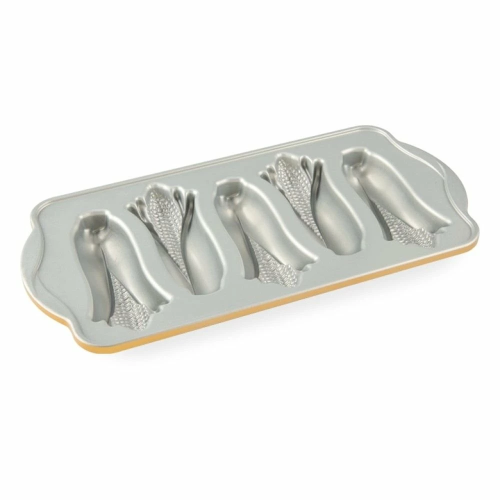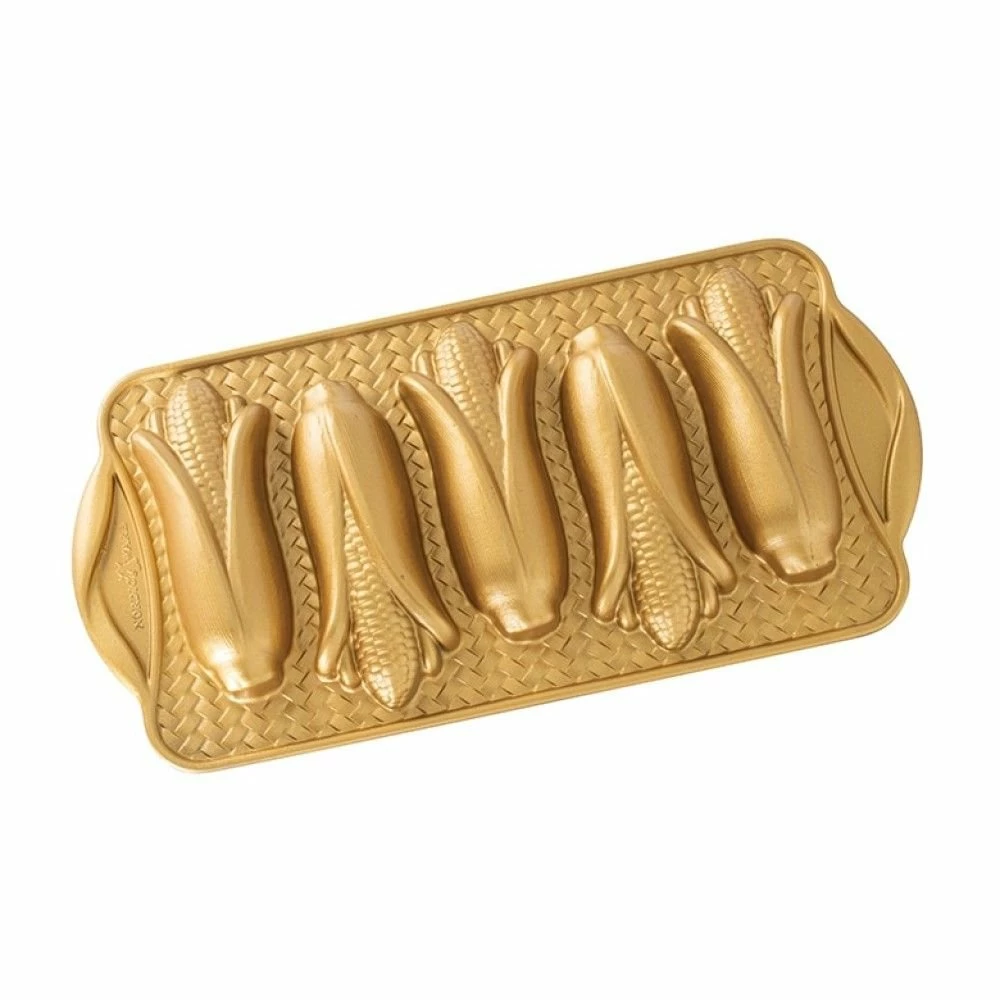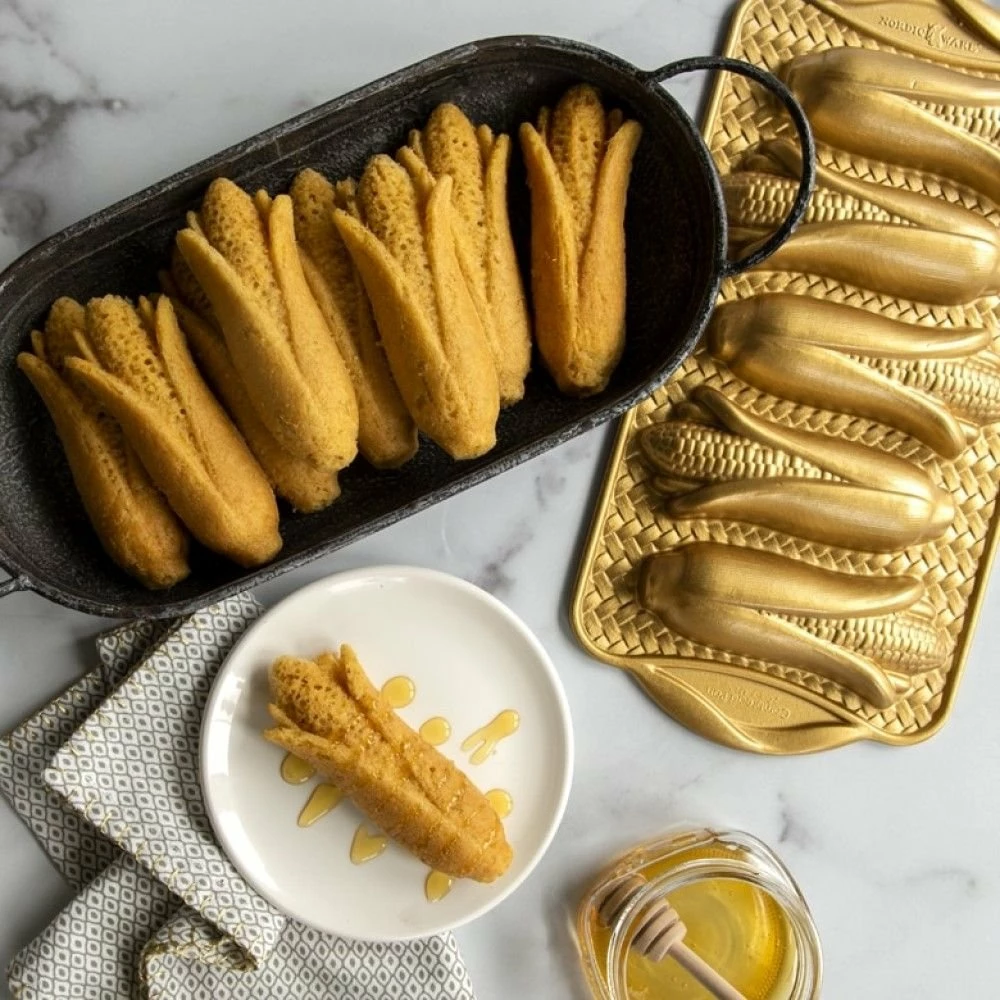 Give your favorite cornbread recipe a fresh twist with the Nordic Ware Corn Cakes Pan! The durable cast aluminum pan makes five mini loaves of cornbread, each molded with detailed kernels and an open husk. Made in the USA with a gold-finished basketweave design, this pan holds 2 cups of batter and is designed to be used for years to come. The nonstick coating easily releases food so you get perfectly formed cakes every time and makes cleanup a breeze. The next time you serve a hearty chili or delicious ham and beans, shine a little spotlight on the humble cornbread side dish with the Nordic Ware Corn Cakes Pan!