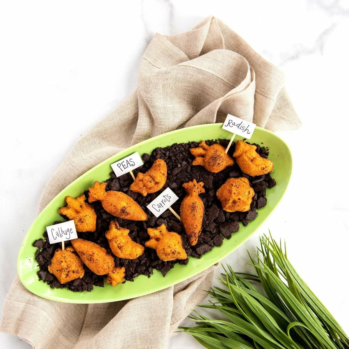 - Makes 20 cakelets in the shapes of carrots, cabbages, peas, and radishes