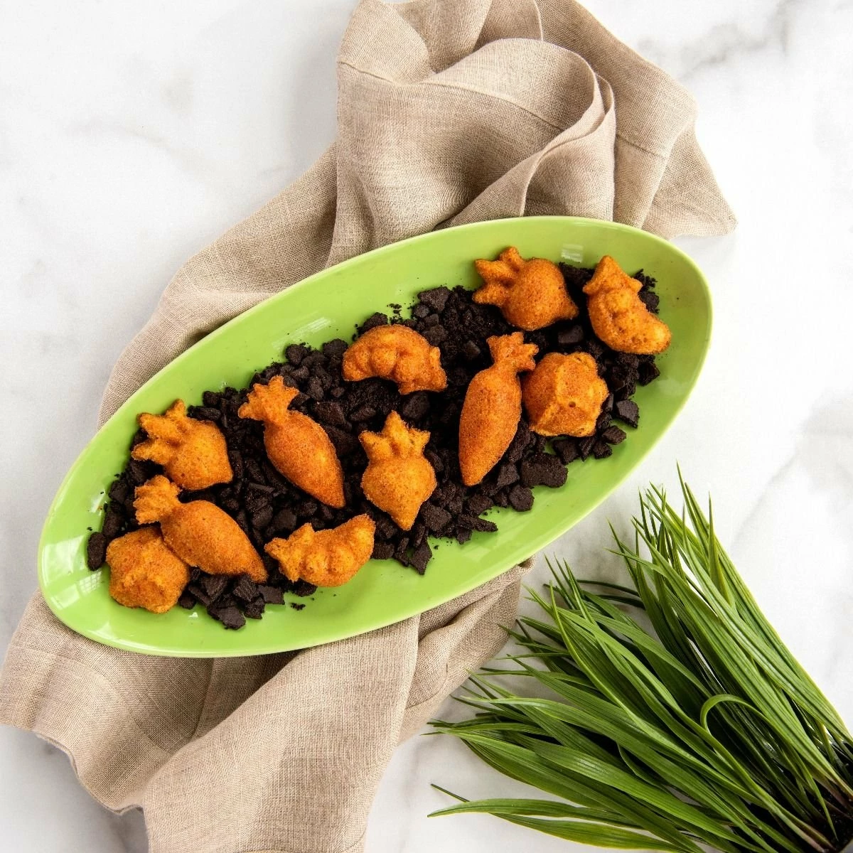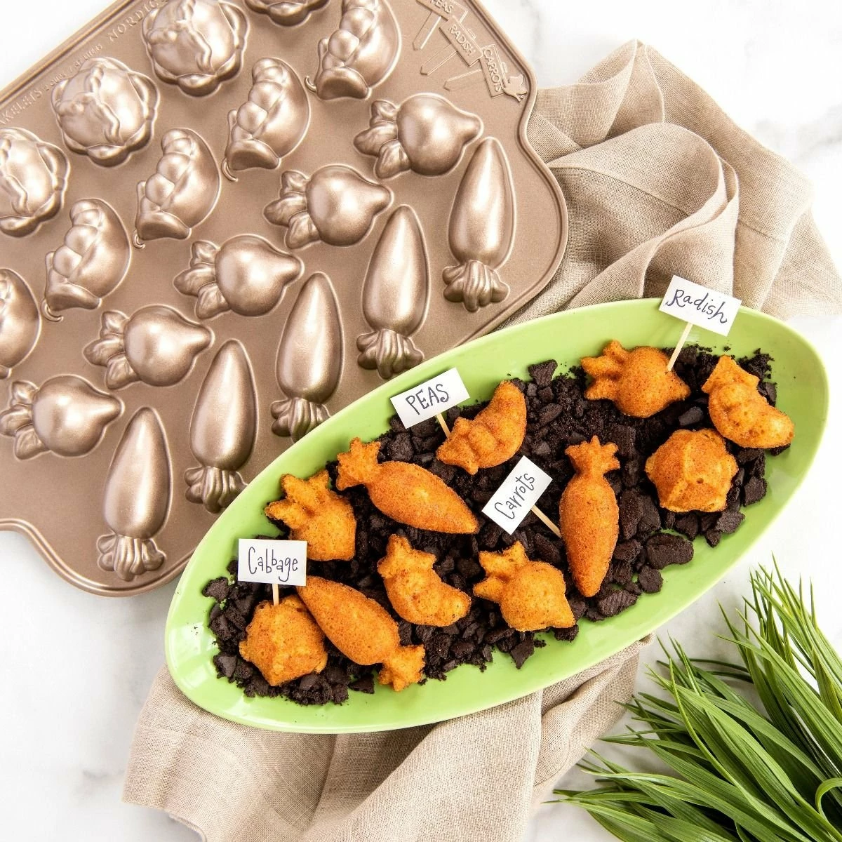 Serve up a bushel of cakelets in adorable vegetable garden shapes baked in the Nordic Ware Garden Patch Pan! This pan makes 20 cakelets in the shapes of cute carrots, choice cabbages, precious peas, and ravishing radishes. The nonstick inner coating ensures that each cakelet will release cleanly without losing any delicate details. Bake a batch of these tiny treats topped with honey or icing, powdered sugar, or candied nuts, or display them topping-free. This pan is perfect for themed parties and Spring celebrations. To preserve this coating, hand-wash the pan after use with gentle cleaners and avoid using metal utensils or scouring pads. Create a charming garden spread on your table and have veggies for dessert with the Nordic Ware Garden Patch Pan!