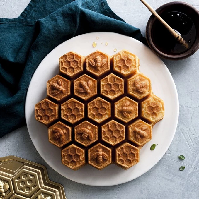 Coffee cake is extra special with this nature inspired cake pan: The Nordic Ware Honeycomb Pull-Apart Pan – Premier Gold Collection. Each six-sided individual honeycomb breaks apart to provide a single serving or the first serving. Sometimes called a cakelet, hefty cast aluminum bakeware delivers superior baking performance. Baked goods rise evenly, cook more uniformly, and have delicious golden crusts because of the excellent conduction of this heavy walled pan. The special, heat reflective exterior and premium non-stick surface assure uniform browning and stick-free results. Some suggest that using pan spray with flour helps release the delicate design with intact shapes and finer details. If you usually bake pull apart cinnamon rolls, try the Honeycomb pull apart for a new treat.