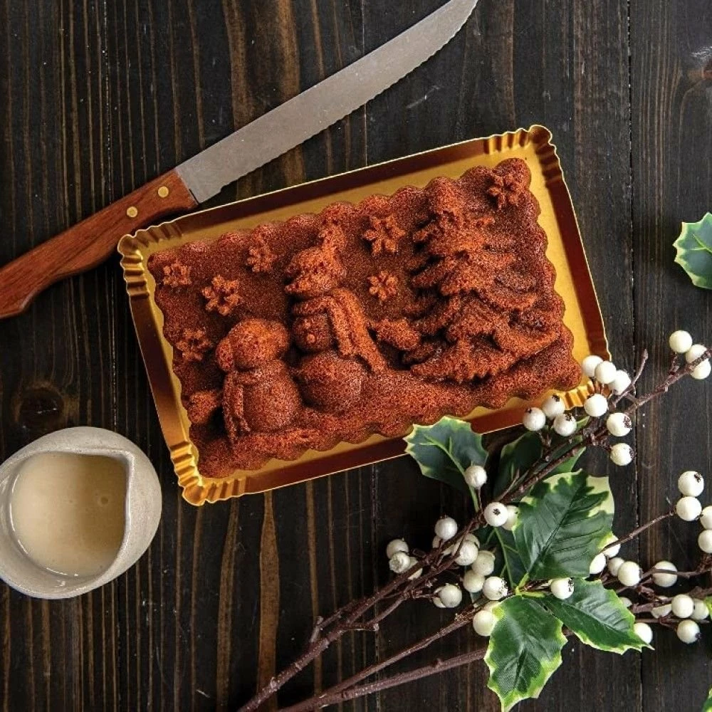 Create a beautiful centerpiece for your next winter dinner party or holiday celebration with the Nordic Ware Winter Wonderland Loaf Pan! This loaf pan features a fun & detailed winter scene of two snowpeople next to a snow-covered fir tree amongst falling snowflakes. Bake a holiday pound cake or spiced cinnamon loaf and decorate with a drizzle of icing or sprinkle with powdered sugar for a lovely snowy effect, or serve as-is for a simple and elegant display that’s sure to impress guests!