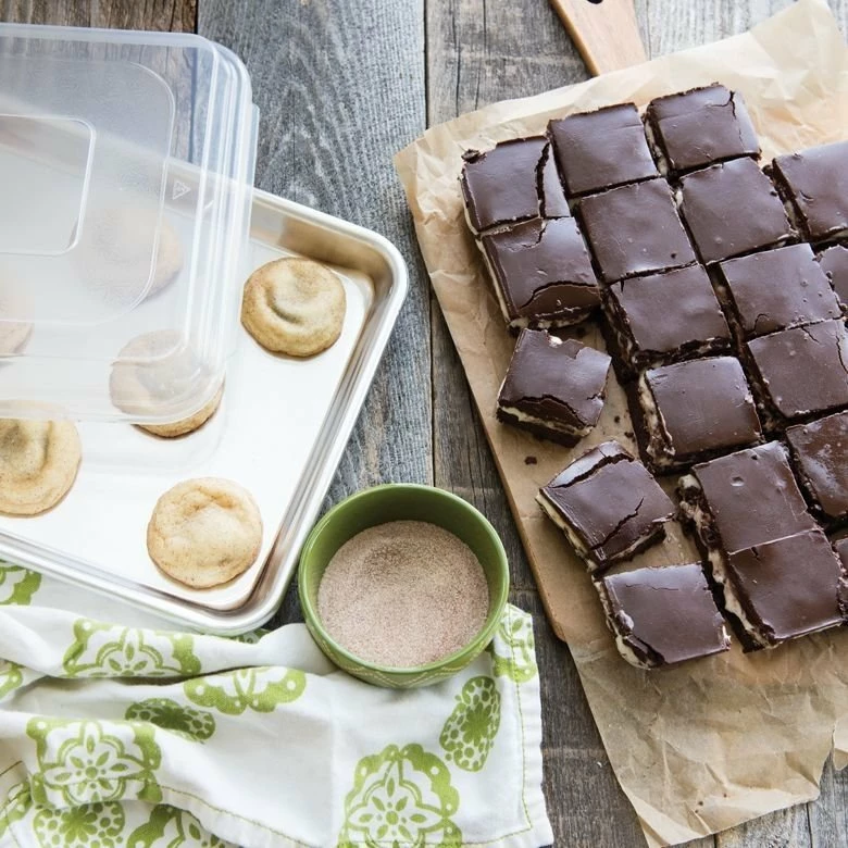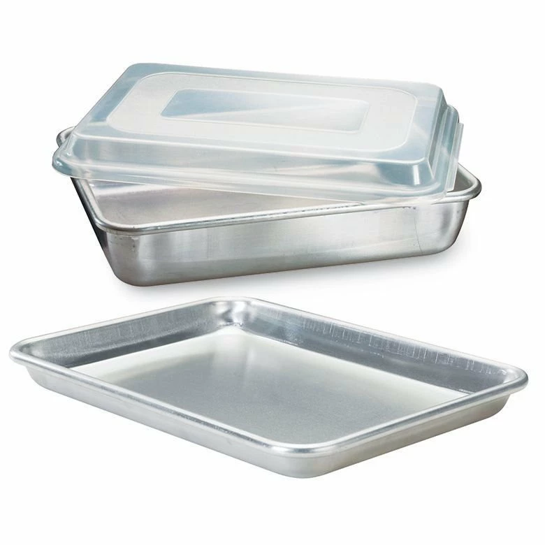 Bake cakes and treats perfectly with the 3-Piece Baker’s Set by Nordic Ware! This set includes a Quarter Sheet Pan and a 9” x 13” Cake Pan with storage lid. These sturdy pans are made of natural, professional-grade aluminum that will never rust while offering superior heat conductivity that gives consistent, evenly browned results every time you bake. A reinforced, encapsulated rim prevents warping and offers lifetime durability. The BPA-free lid makes it easy to store a cake in the pan, or to transport roasted potatoes to a potluck. When you add these pans to your baking collection, you’ll understand why professional grade aluminum pans are the preferred choice for bakeries and commercial kitchens. Use the pans to roast vegetables, bake desserts, toast nuts, and more!