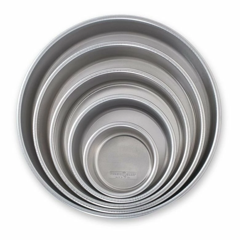 Bake a showstopper of a wedding or banquet cake with the 5-Piece Banquet Set by Nordic Ware! This set includes a 4”, 6”, 8”, 10”, and 12” round cake pan for stacking cakes to make impressive multi-layered creations or for baking individual desserts. Made of natural, professional-grade aluminum that will never rust, these pans offer superior heat conductivity that gives consistent, evenly browned results every time you bake. A reinforced, encapsulated rim prevents warping and offers lifetime durability. When you add these pans to your baking collection, you’ll understand why professional grade aluminum pans are the preferred choice for bakeries and commercial kitchens. Use them to make a towering, elegant cake for a wedding, a multi-flavored, multi-colored creation for a fun event; or use them one at a time for single cakes.