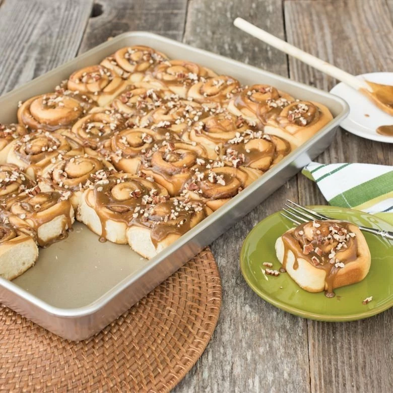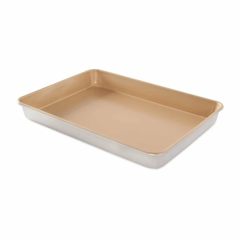 Bake a thick sheet cake that will be the hit of any birthday part with the Nonstick High-Sided Sheet Cake Pan by Nordic Ware! Made of natural professional-grade aluminum that will never rust, this high-sided sheet pan offers superior heat conductivity which promotes even rising and gives consistent, evenly browned results every time you bake. A reinforced, encapsulated rim prevents warping and offers lifetime durability, while a nonstick coating ensures everything you make will come off the pan perfectly. Nearly twice as deep as a standard baking sheet, this Nonstick High-Sided Sheet Cake Pan is the tool you need to make a bakery style sheet cake, plus, it’s great for roasting a chicken with root vegetables and other meals that create a lot of juice.