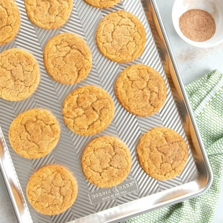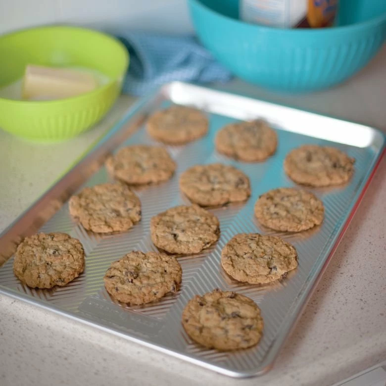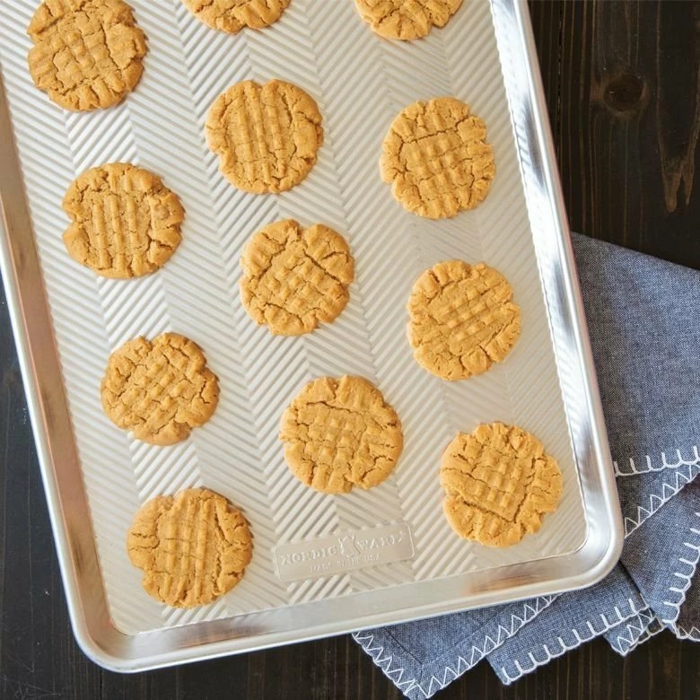Nordic Ware Prism Half Baking Sheet, Natural Prism Bakeware has improved airflow for crisper chocolate chip cookies. The natural aluminum offers the best possible heat dispersion to create perfectly browned baked goods. The herringbone look is embossed into the cookie sheet and is more than just attractive. It adds strength and durability. This half baking sheet is scratch resistant and is easy to lift cookies off of the sheet. Nordic Ware is an American success story since 1946.