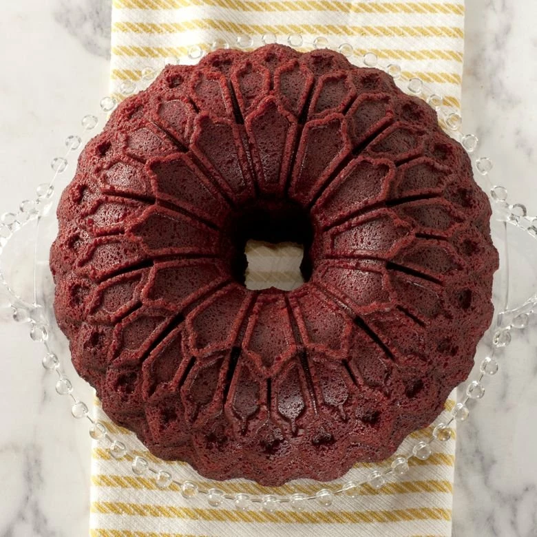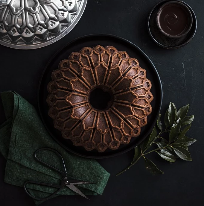 Equal parts artful and delicious; the Nordic Ware Stained Glass Style Bundt Pan is an excellent addition to your bake ware! The cast aluminum material bundt pan contains a helpful non-stick inner coating so cakes easily slide out with minimal effort and zero damage to the pattern. Nordic Ware understands that quality is important by providing a lifetime warranty for this American made pan. The intricate stained glass window style pattern provides an elegant design for any celebration. Create decadent red velvet cakes beautifully coated in white chocolate ganache, or a fluffy angel food cake. Whatever the occasion, your friends and family will love the beauty and taste of your cakes made with the Nordic Ware Stained Glass Style Bundt Pan.