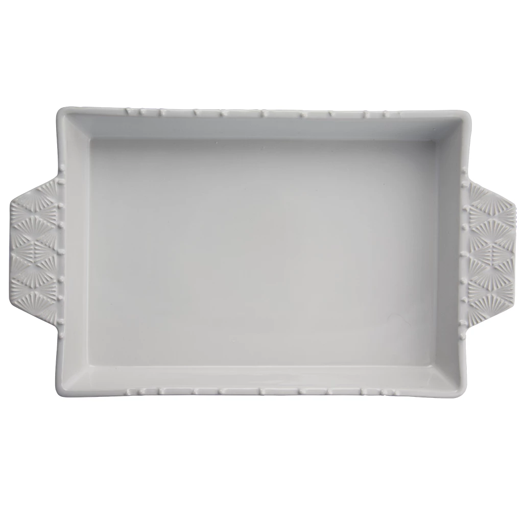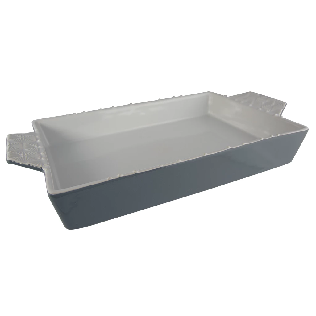 Bake and serve delicious breakfast casseroles, hearty lasagnas, decadent fudge brownies and more in this family-sized Taste of Home Stoneware Baking Dish from Range Kleen! This dish is made of glazed stoneware for a piece of bakeware that is durable, scratch-resistant and functionally non-stick. With its gray exterior, white interior and handles featuring unique geometric embossments, this baking dish is also an attractive serving piece. Safe for the oven, microwave, freezer and dishwasher, you can use this dish to store, reheat and wash with no hassle. With Range Kleen’s 13″ x 9″ Stoneware Baking Dish, both the taste and presentation of your favorite baked goods will be sure to impress your friends and loved ones, so don’t hesitate to order yours today!