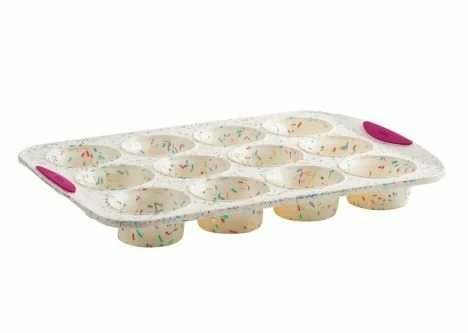 Colorful strips of confetti cover the White 12-Count Silicone Muffin Pan by Trudeau to give your kitchen an attractive bakeware piece that celebrates the joys of baking. Designed with an integrated steel structure, the muffin pan provides you with easy, comfortable handling. Durable, heat-resistant silicone enhances the muffin pan’s reliability, while the lack of BPA improves its safety. The pan resists a wide range of temperatures up to 428°F. This allows you to safely bake muffins or cupcakes in the oven, reheat them in the microwave, or store them in the freezer. The dishwasher gives you a quick, easy option for cleaning. If you’re going to bake, then do so your way: with style. And now, that way is with the brightly festive Trudeau’s White Confetti 12-Count Silicone Muffin Pan.