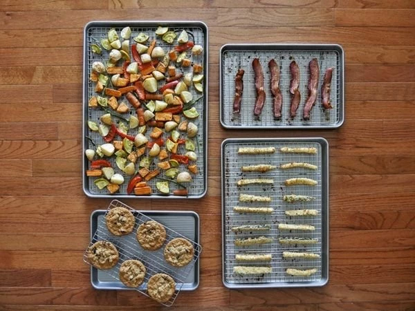- Bakeable cooling rack is steel, the rest of the bakeware set is made out of Aluminized Steel