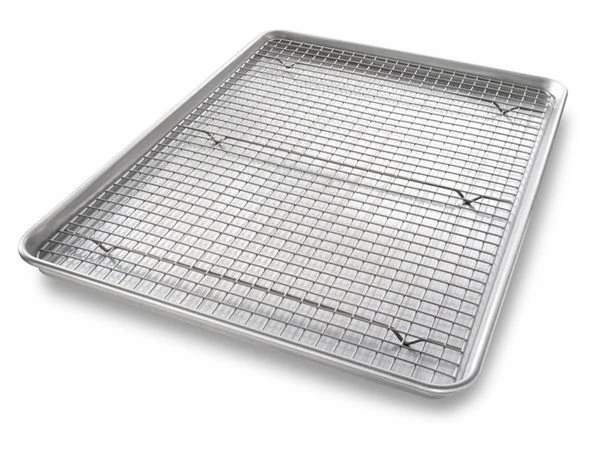 Load up jelly rolls, cookies, cakes, or scones on this USA Pan Nonstick Extra Large Sheet Pan & Cooling Rack Set for an evenly baked and uniformly cooled outcome. Made in the USA out of aluminized steel and steel, this sheet pan and cooling rack are lifetime pieces for your kitchen. The extra large sheet pan has an innovated fluted design that facilitates air circulation and maximized pan strength to help resist warping, while the cooling rack features a steel cross-wire design and a 6 raised feet. Bake delicious pastries to perfection on your new USA Pan Nonstick Extra Large Sheet Pan & Cooling Rack Set.